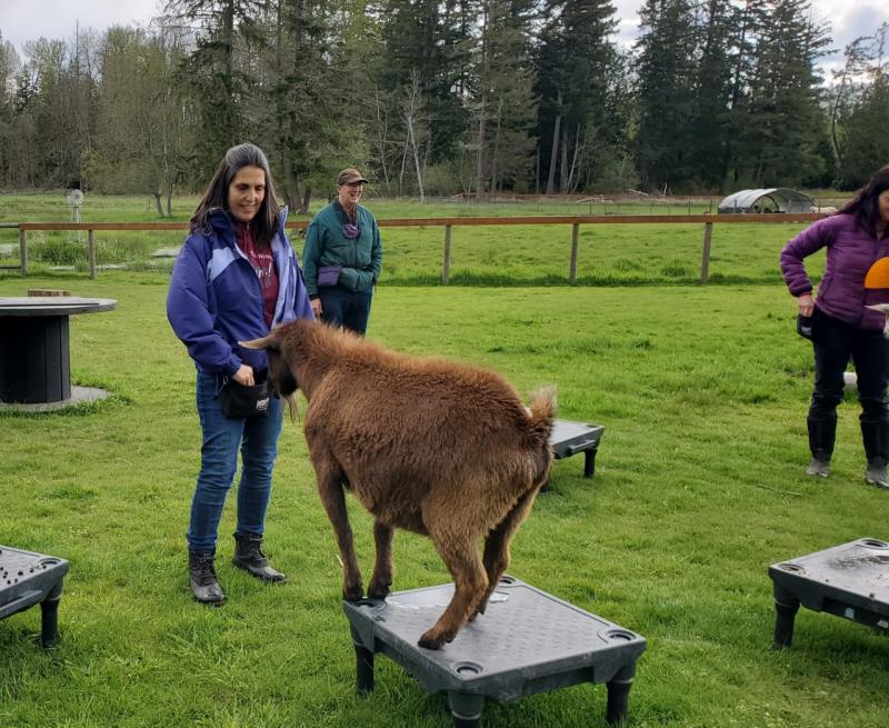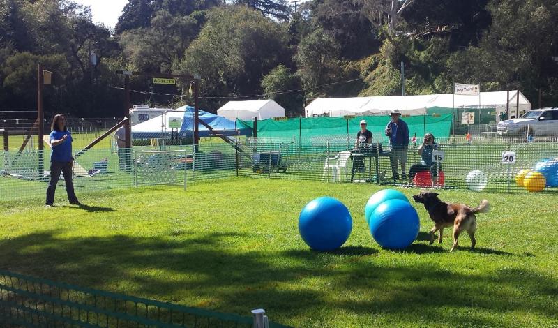 Cheryl and Eevee enjoying a treibball match (dog is sent out, waits for the cue to push specific ball to the handler).